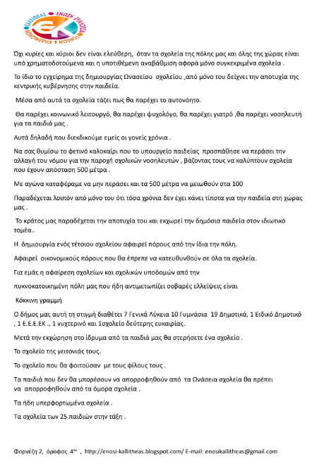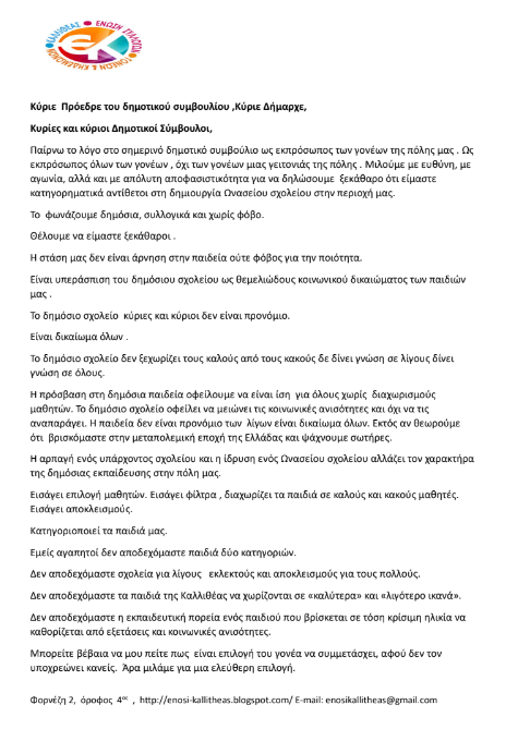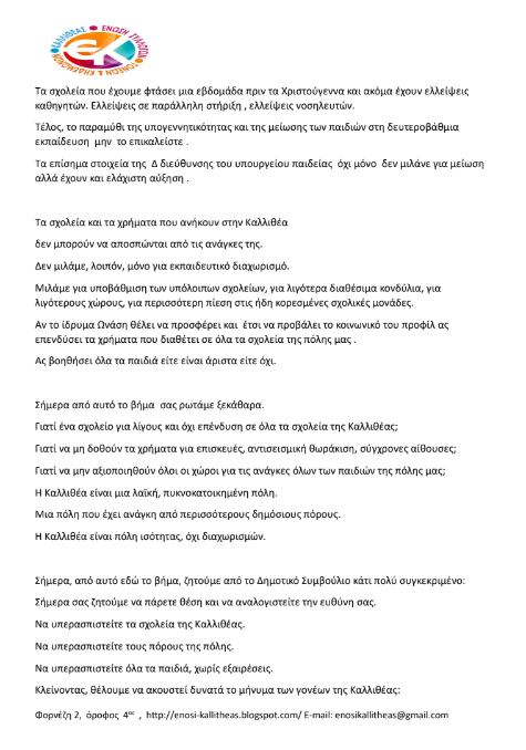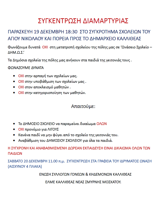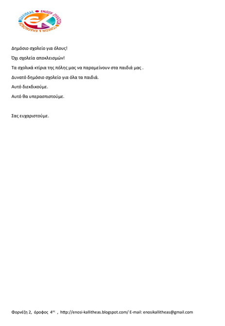 Η Ένωση Συλλόγων Γονέων Καλλιθέας στηρίζει την εκδήλωση και ενώνει την φωνή της μαζί τους .