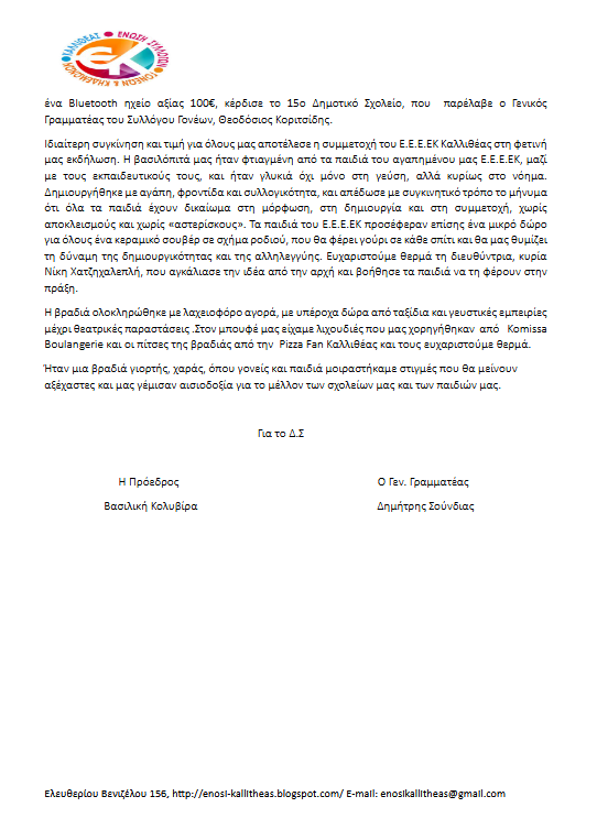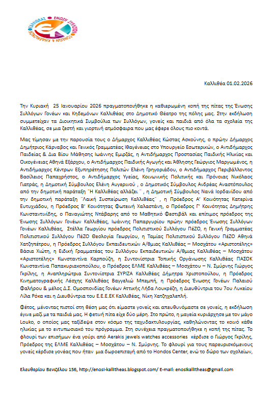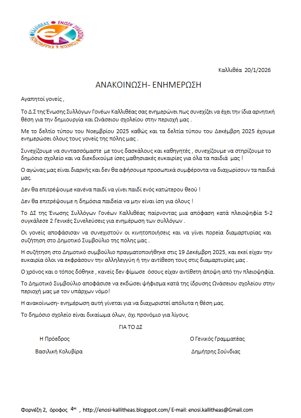 Για το Δ.Σ της Ένωσης Συλλόγων Γονέων ΚαλλιθέαςΗ Πρόεδρος Ο Γεν. Γραμματέας