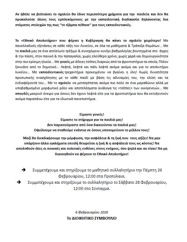 Γονείς, εκπαιδευτικοί, μαθητές, που χρόνια τώρα, ως αποτέλεσμα των διαχρονικών ευθυνών όλων των κυβερνήσεων που επιλέγουν να μην στηρίξουν το Δημόσιο Σχολείο...