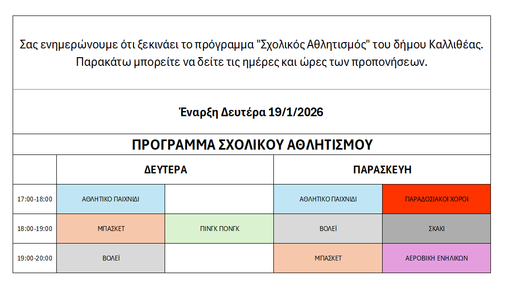 Την Τρίτη 21/1/2025 ξεκίνησαν στο σχολείο μας οι δωρεάν προπονήσεις στο πλαίσιο του προγράμματος "Σχολικός Αθλητισμός" που διοργανώνει ο δήμος Καλλιθέας. Οι προπονήσεις είναι δωρεάν για όλα τα παιδιά του σχολείου.