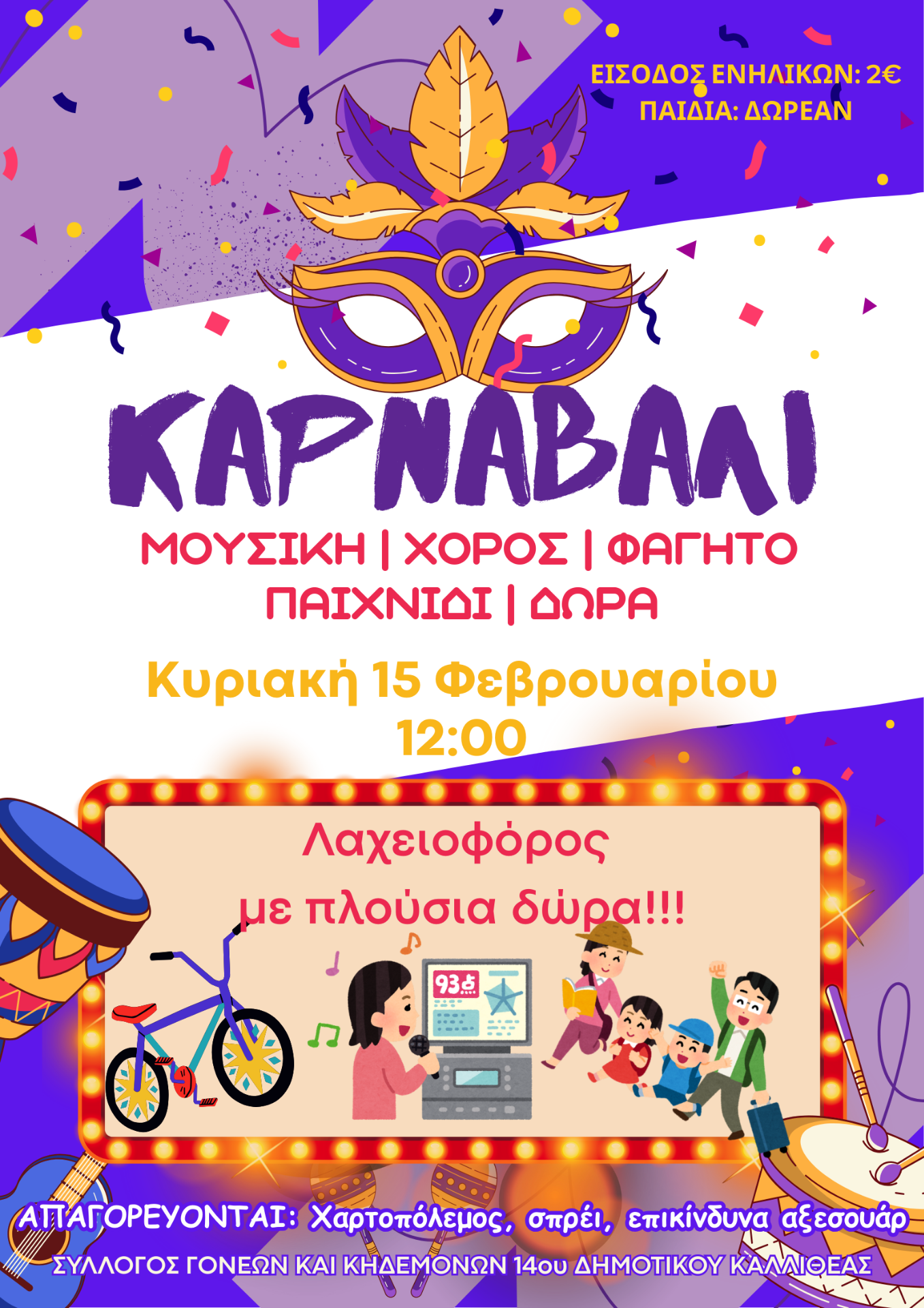 Ο Σύλλογος Γονέων και Κηδεμόνων σάς προσκαλεί στο αποκριάτικο πάρτι που διοργανώνει την Κυριακή 27/2/2022 ώρα 11:30 στο προαύλιο του σχολείου μας.